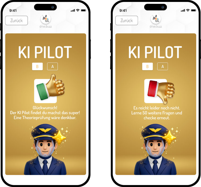 Schluss mit dem Rätselraten, ob ein Schüler prüfungsreif ist! Der neue KI-Pilot wertet das Lernverhalten deiner Schüler aus und gibt dir eine klare Empfehlung zur Theorieprüfung – direkt in der Schülerliste, rechts beim Lernstatus von drive.buzz. 👉 Ein Klick auf den Piloten genügt – und du siehst sofort, ob genügend Daten vorliegen. 👉 Wenn ja, bekommst du eine Empfehlung: Daumen hoch, neutral oder keine Empfehlung. 👉 Die Einschätzung basiert auf echten Lerndaten und über 300 Verhaltenskriterien. Du möchtest mitwirken? Hinterlasse deine eigene Einschätzung, ob du zustimmst oder nicht – aber Achtung: nur einmal pro Schüler und vor der Prüfung. 📌 Aktuell in der Beta-Phase 🔒 Gilt für Klasse B & nur bei Erstprüfung ✅ Aktiviert, sobald min. 100 Fragen & 10 Vorprüfungen erledigt wurden